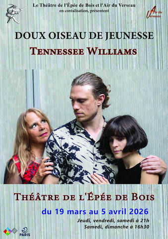 La Compagnie « L’Air du Verseau », dont nous avions bien aimé « Pôles » en 2022, et « La Maison d’à Côté » (2024), au Studio Hébertot, revient avec « Doux Oiseaux de Jeunesse », une pièce écrite par Tennessee WILLIAMS, en 1959, et cette fois au Théâtre de L’Épée de Bois. Une oeuvre intéressante, interprétée par des comédiens de talent ! Ne boudez pas votre plaisir ! Du 19 Mars au 5 Avril 2026 Les Jeudis, Vendredis, Samedis à 21h00 Matinées Les Samedis et Dimanches à 16h30 THÉÂTRE DE L’ÉPÉE DE BOIS 01 48 08 39 74 Robert BONNARDOT