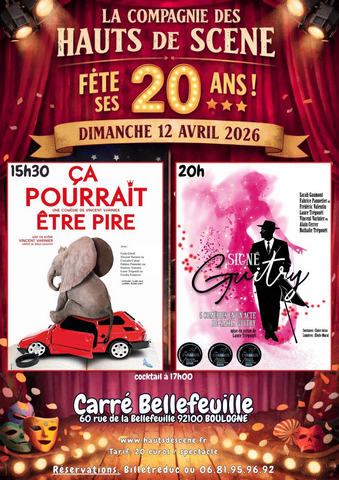J’en ai vu beaucoup des spectacles proposés par La Cie des Hauts de Scène, basée à Boul’Bi, et ce fut toujours un réel plaisir !!! Le temps passe vite, j’étais présent lors de la commémoration de leur Dix Ans. Une troupe très talentueuse: Sarah GAUMONT, Laure TREGOUËT, Vincent VARINIER, Carla GIROD, Fabrice PANNETIER, Nathalie TREGOUËT, Frédéric VALENTIN… Ils ont remporté récemment un très vif succès avec « Signé Guitry », au Théâtre de Passy. Ils fêtent leurs 20 ans, dans l’iconique salle de théâtre à Boulogne-Billancourt, « Le Carré Bellefeuille ». Ã cette occasion, deux spectacles à l’affiche: DIMANCHE 12 AVRIL 2026 à 15h30. « Ça Pourrait Étre Pire » (1h20) et à 20h00: « Signé Guitry » (1h15) Deux affiches que je vous recommande chaleureusement, un très bon moment à passer !!! THÉÂTRE LE CARRÉ BELLEFEUILLE Réservations: 06 81 95 96 92 Robert BONNARDOT