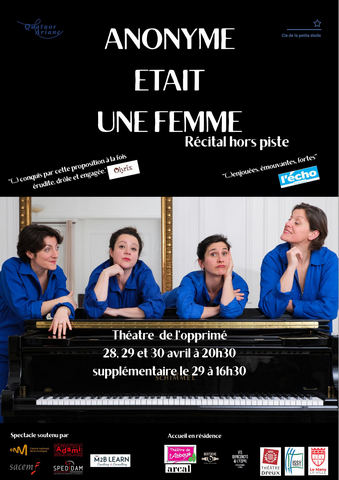 Un spectacle où ce quatuor, qui n’est plus tout à fait celui dont j’avais parlé en février 2025, revient au Théâtre de L’Opprimé. « ANONYME ÉTAIT UNE FEMME », est un spectacle qui rend hommage à des compositrices d’hier et d’aujourd’hui. Un cri de justice et de liberté, dans un éclat de rire ! Le QUATUOR ARIANE, vous propose un récital lyrique… D’un nouveau genre, c’est parfois burlesque, et très talentueux!!! Les autrices: Violaine FOURNIER & Morgane BILLET Ce quatuor s’est donné mission de faire entendre les voix de celles que l’Histoire de la Musique a trop souvent tues: Les Compositrices. Celles dont les noms sont parfois, trop vite oubliés… Un spectacle de: Violaine FOURNIER & Morgane BILLET Avec: Flore FRUCHART Éléonore SANDRON Morgane BILLET Agathe TRÉBUCQ Lumières: Angélique BOURCET Création Costumes: Alice TOUVET Mise en Scène: Violaine FOURNIER et Florence SAVIGNAC Du 28 au 30 Avril 2026 (Mardi 28 à 20h30 Mercredi 29 à 16h30 et 20h30 Jeudi 30 à 20h30) Durée: 1h10 THÉÂTRE DE L’OPPRIMÉ 01 43 45 81 20 Robert BONNARDOT