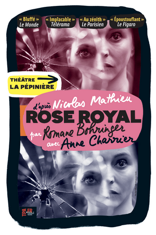 Un spectacle avec une distribution, qui force l’admiration, que des artistes de grand talent ! « ROSE ROYAL » d’après Nicolas MATHIEU Une adaptation de l’éblouissante Anne CHARRIER et du fantastique Gabor RASSOV, dont je n’ai jamais oublié le bon moment passé, avec « Les Amis du Placard ». Alors bien évidemment, la troublante Romane BOHRINGER, n’est jamais loin, et elle en signe la Mise en Scène. Sur scène: Anne CHARRIER Elle va vous éblouir ! Collaboration Artistique: Aurélien CHAUSSADE Création Lumières: Thibault VINCENT Scénographie: Rozenn LE GLOAHEC Costumes: Céline GUIGNARD Les Mercredis à 21h00 Durée: 1h15 THÉÂTRE LA PÉPINIÈRE 01 42 61 44 16 Robert BONNARDOT